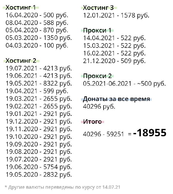 Так как цели сбора не всегда были точны, я публикую вам полный список трат и донатов на сервер.