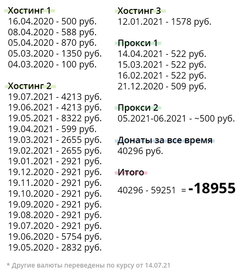 Так как цели сбора не всегда были точны, я публикую вам полный список трат и донатов на сервер.