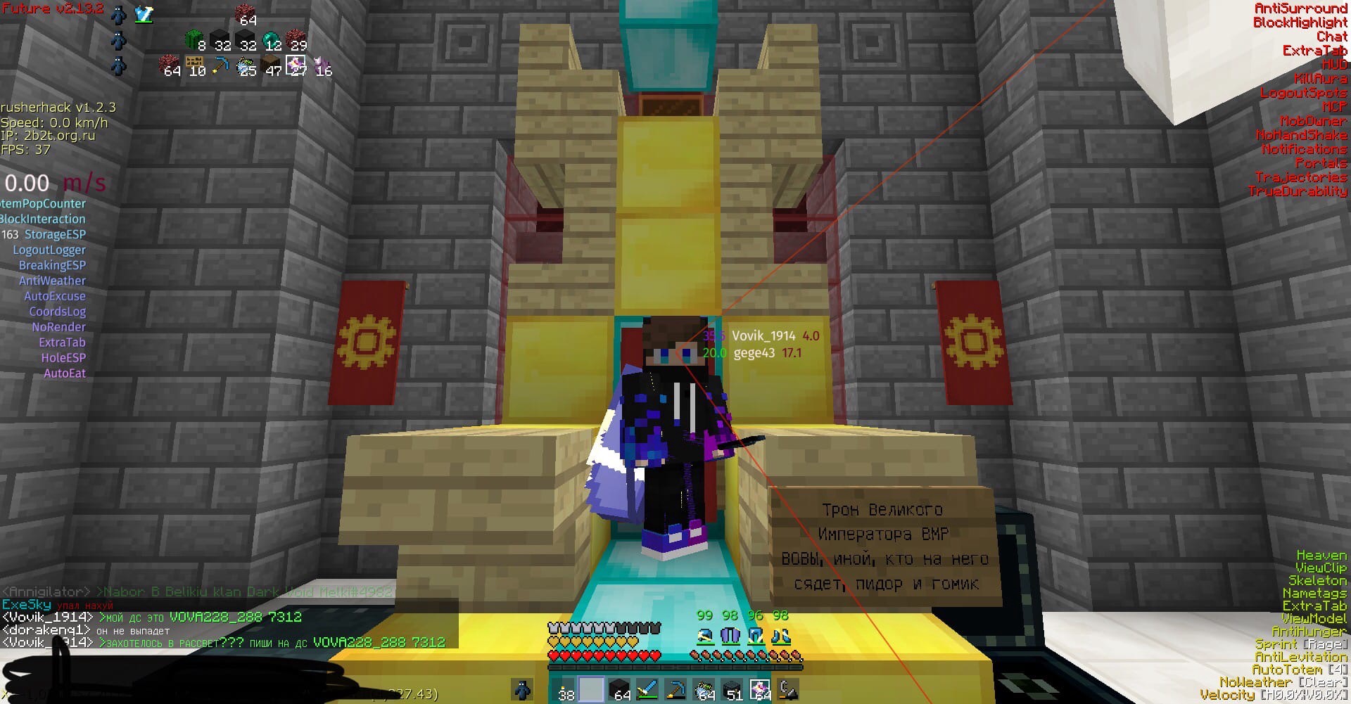 Но вот прилетел Рома, который сказал что сюда летит половина спейсес убивать нас. Я кинулся спасать своих, тех кто копал, потому что я хоть и не мастер кпвп, но уж точно по лучше zet9 и бетдикара, которые тогда копали. Я сказал им об этом и немного начал паниковать. Когда оказалось что это фейк орс начал раздавать награды в виде пвп китов тем кто копал. Я в шутку спросил – “ а мне чтонибудь будет?” (тогда я хотел купить дабл и дать 18 шалкеров с ек и 9 шалкеров кирок иис, и мне жалкий пвп кит за даром не был нужен), и орс, орудуя словами владика, с которым мы повздорили немного до нападения попбоба и ромы, который сказал что я страдал херней, и орс сказал такую фразу, которой окончательно разрушил мое доверие к иис. Я был предан делу и иис, я честно работал, я уважал орса,артгор и других. Я копал, строил, работал ради идеи…. А орс выбросил все мои старания на помойку словами “Не, ну ты реально страдал херней.”….. А ведь я старался, работал, хотел пожертвовать киты стоимостью в 1к рублей, я был предан… Я ушел из иис, взорвал немного кольцевой, и присоеденился к логко, попбобу и другим врагам иис. С тех пор я так и сражался против них. Я хотел стать лучше в кпвп и купил фьючер, но он конфликтовал со всем что может конфликтовать и крашил мне комп постоянно, поэтому я его удалил и сбагрил какому то нубу за низа что. Потом я нашел кряк аббуса и рашерхака, и стал играть с ними.