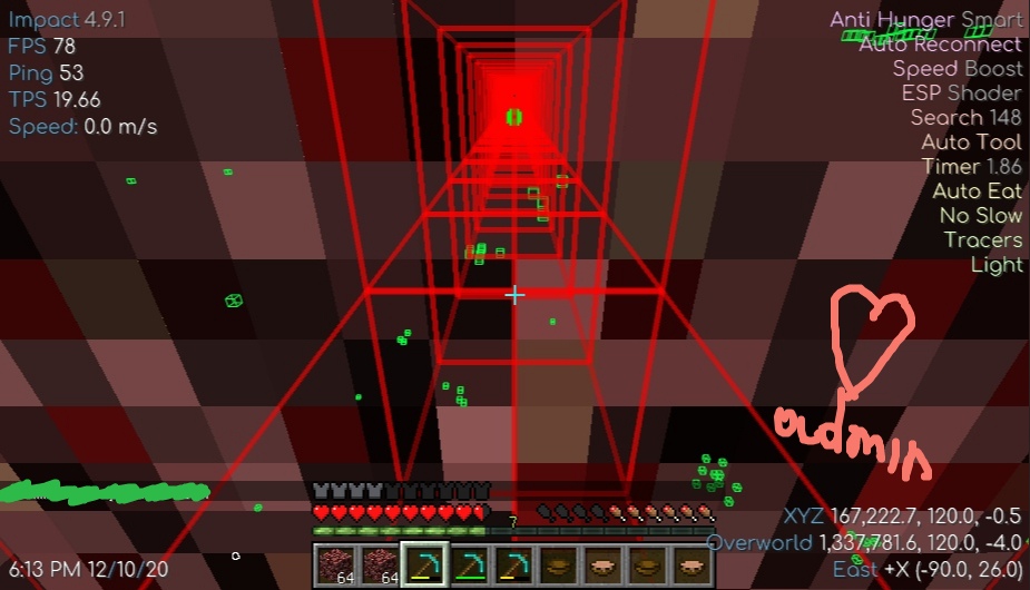 Недавно я научился абьюзить timer, позавчера выкопал 100к, а вчера выкопал 200к. Сейчас я продвигаюсь со скоростью 2.5 блока в сек, самая быстрая кирка в майнкрафте - золотая, но так как она быстро ломается, я копаю алмазными. Буду рад любым советам по оптимизации процессов добычи кирок и спидхакам.