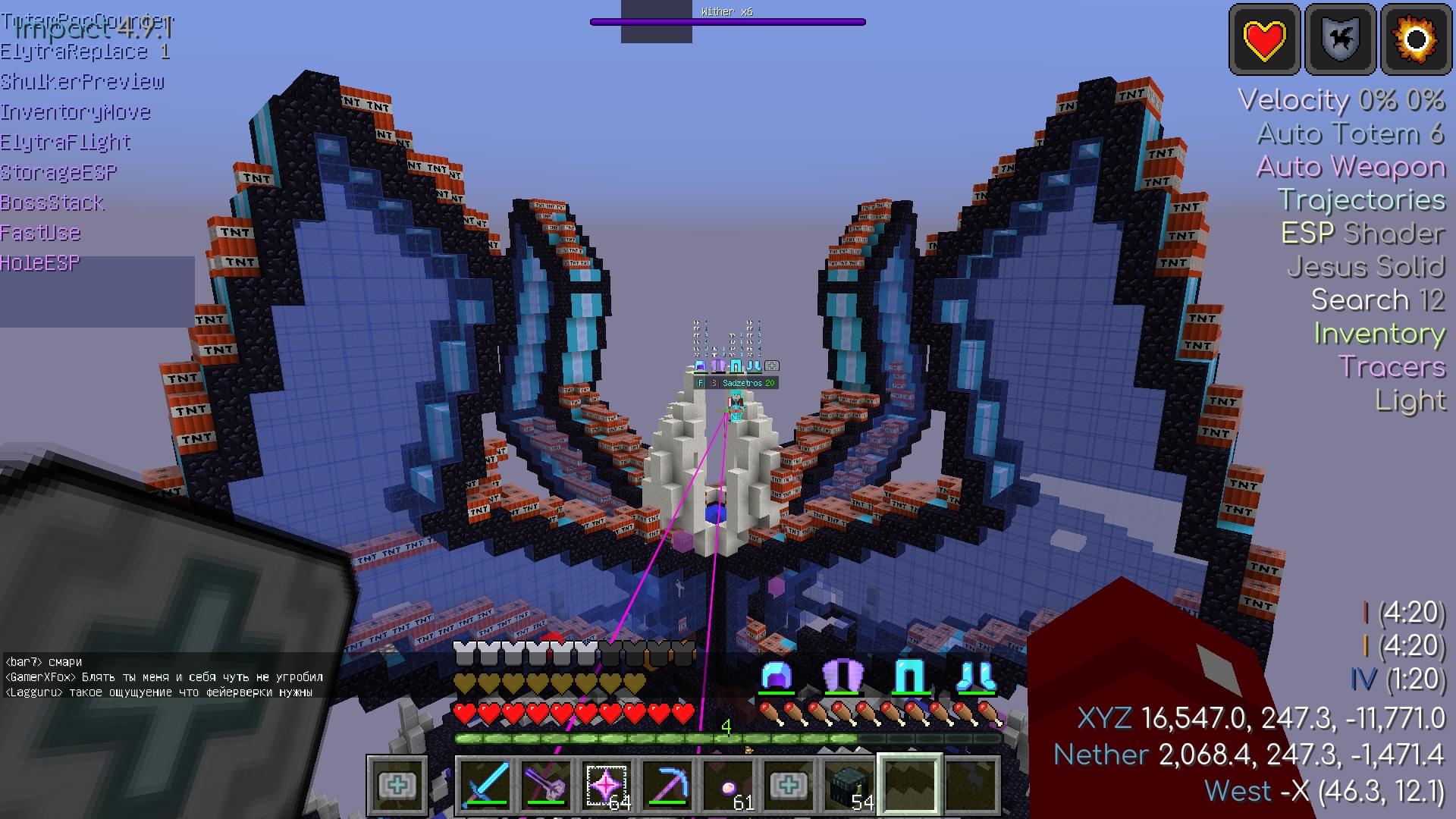 Мы с моим соклановцем Sadzetros (единственным, хнык(() не придали этому посту никакого значения, играли в кто в гта, кто в фаллаут. Сегодня мы решили отправится в энд и полетели к порталу. Он оказался сломан, как и последующие за ним 6 штук (админ почини!!! - починю). На 8 портале нас ждало нечто большее чем какой-то там энд, а именно эта база. Без всяких размышлений мы решили вытащить с нее ресурсы и взорвать, поспав на ней, мы перетаскали примерно 150-200 шалкеров с полезностями на нашу базу. После этого нам осталось только заложить тротил и призвать визеров. Вот что получилось, координаты в открытом доступе.