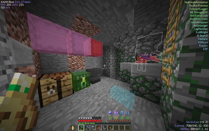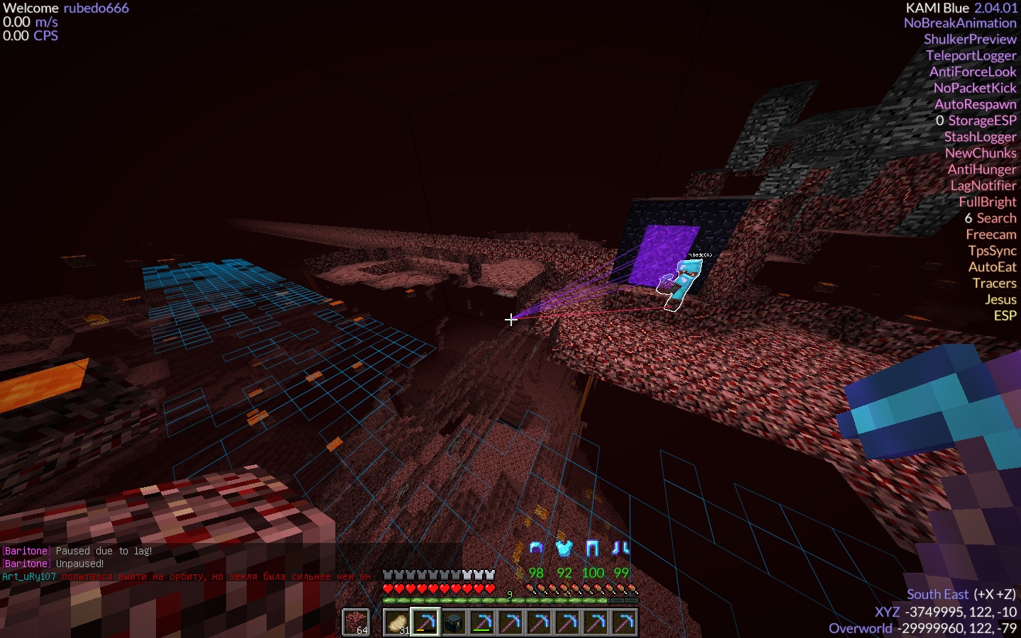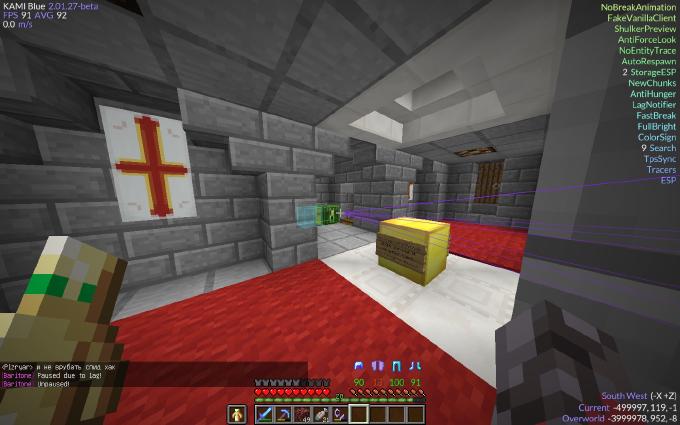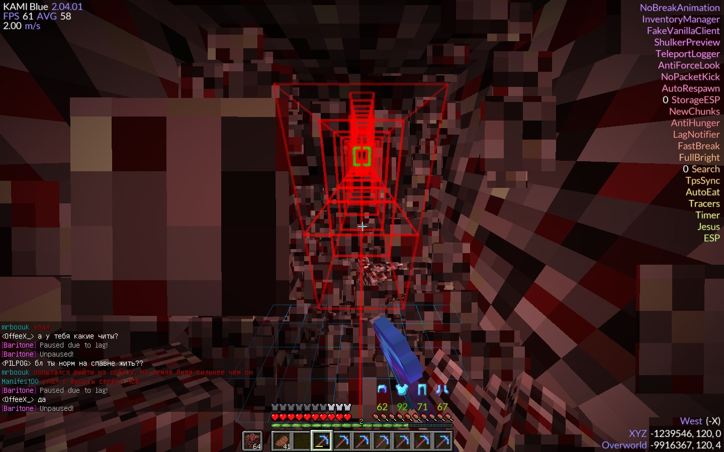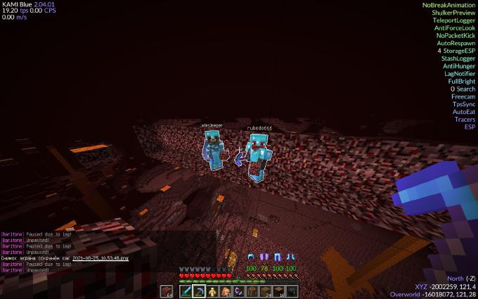 Когда всё было готово, я выдвинулся продолжать копать туннель. Так как для экономии времени и ресурсов было запланировано чинить кирки то, для этих целей в моём kami blue был включён inventory manager, также он выполнял функцию отчистки инвентаря от адского камня. Начав копать, скоро мной было замечено, что баритон в момент низкого тпс постоянно застревал, хотя перед ним не было блоков, это явно было связано с лагами на сервере, поэтому был включён LagNotifier который, решил эту проблему.