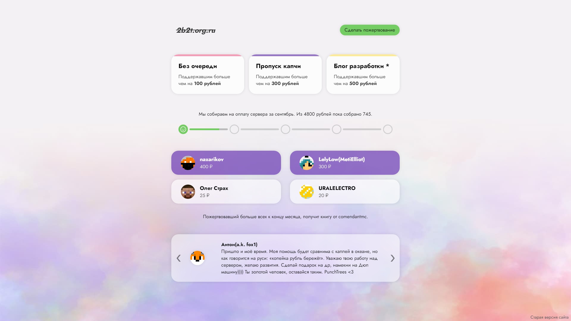 Привет, как некоторые уже наверное заметили, сайт donate.2b2t.org.ru обновился. Этот пост расскажет подробнее об обновлении.
